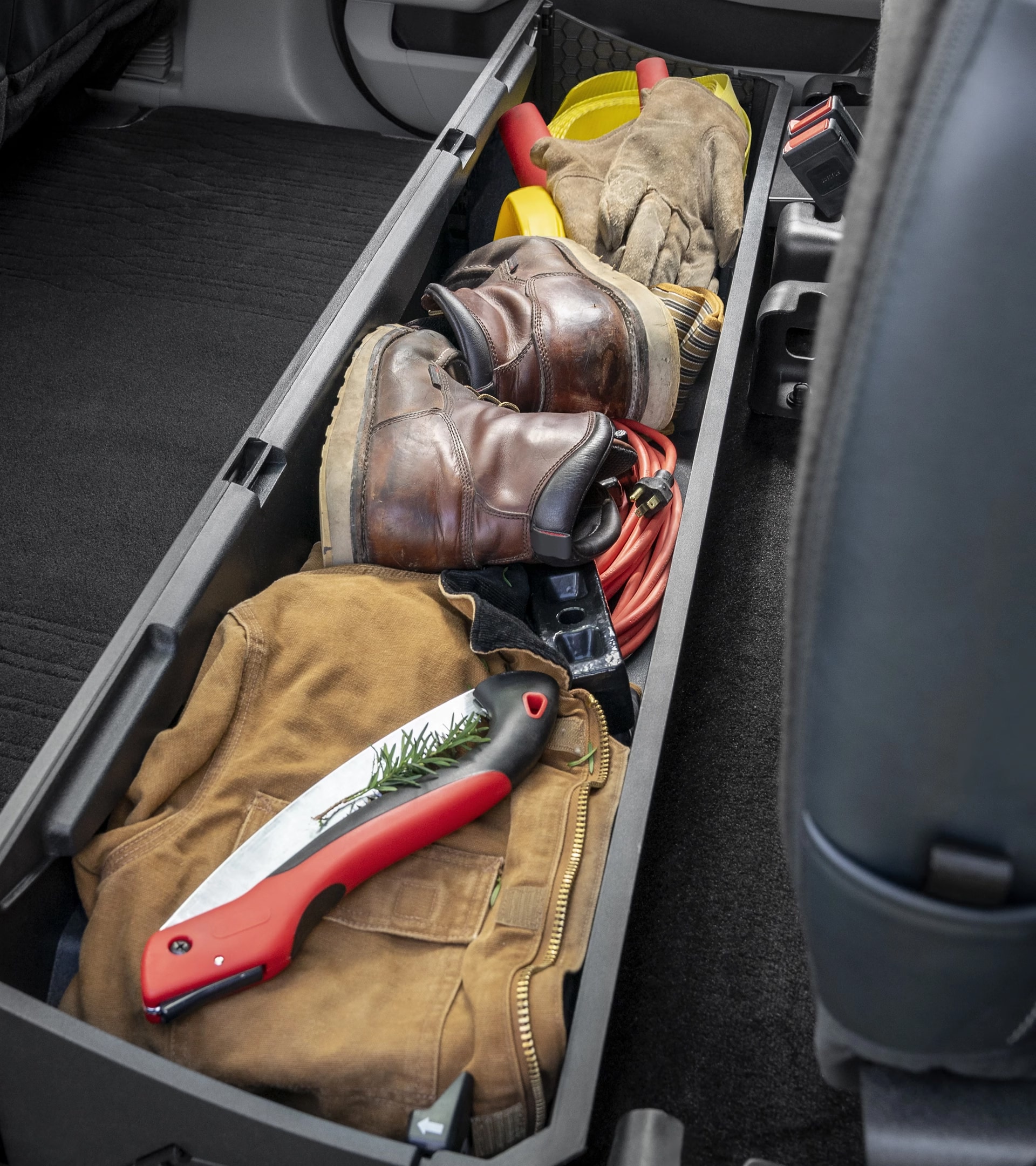 Super Duty four-door Crew Cab offers an available folding, lockable under-seat box. It's integrated into the floor of the vehicle for convenient and secure storing of tools and gear.
